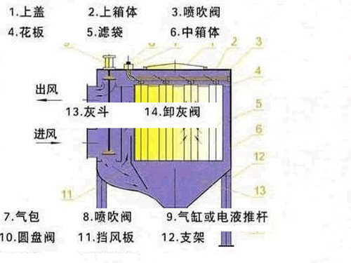 反吹(吸)風系統(tǒng)包括反吹(吸)風機、反吹(吸)風管、氣缸、電磁閥、測壓裝置、閥板及壓縮空氣管路等。